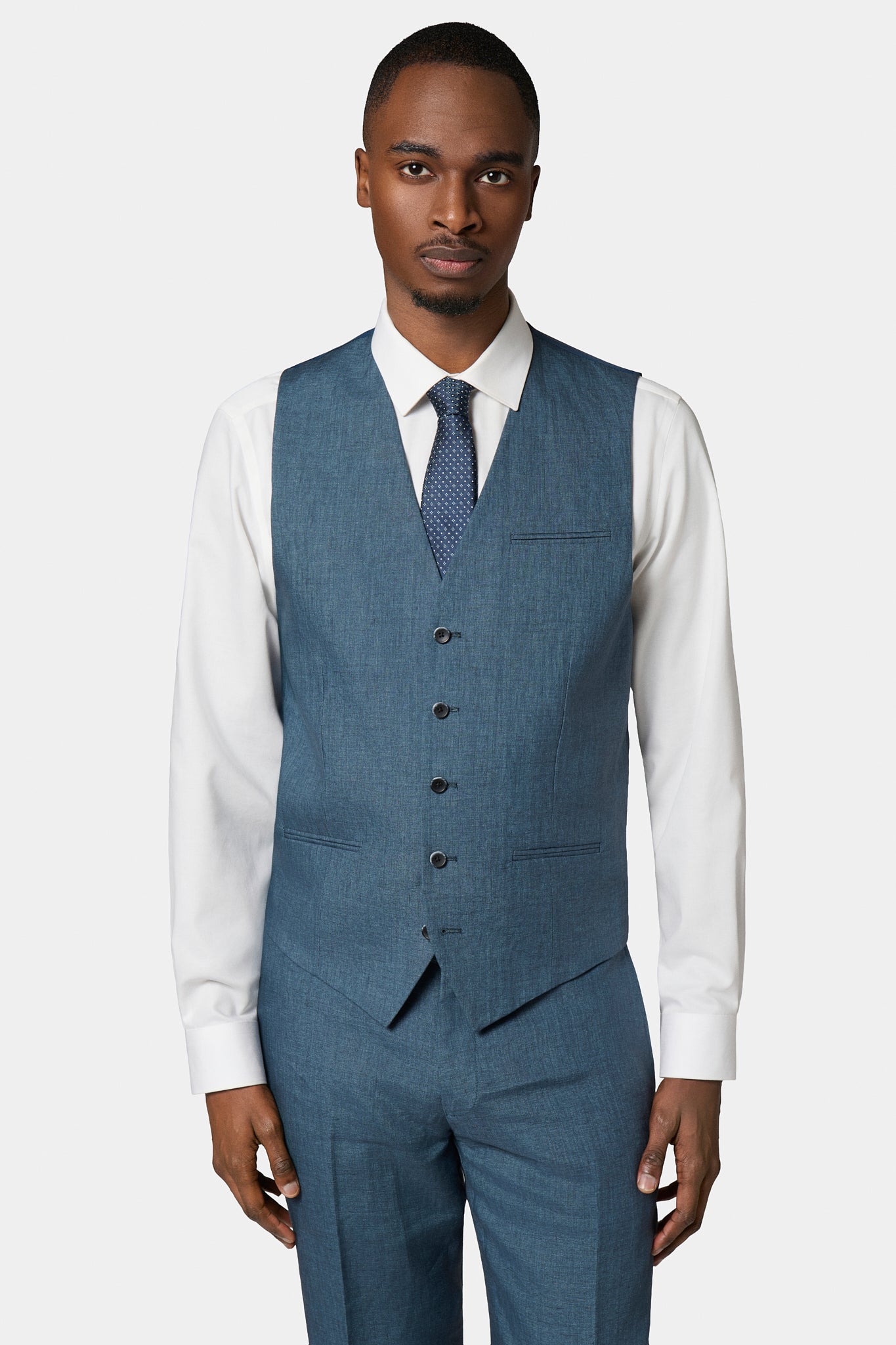 La taille s’ajuste parfaitement grâce à sa patte de réglage Tissu pur lin chiné Simple boutonnage Poches passepoilées décoratives Entièrement doublée