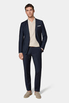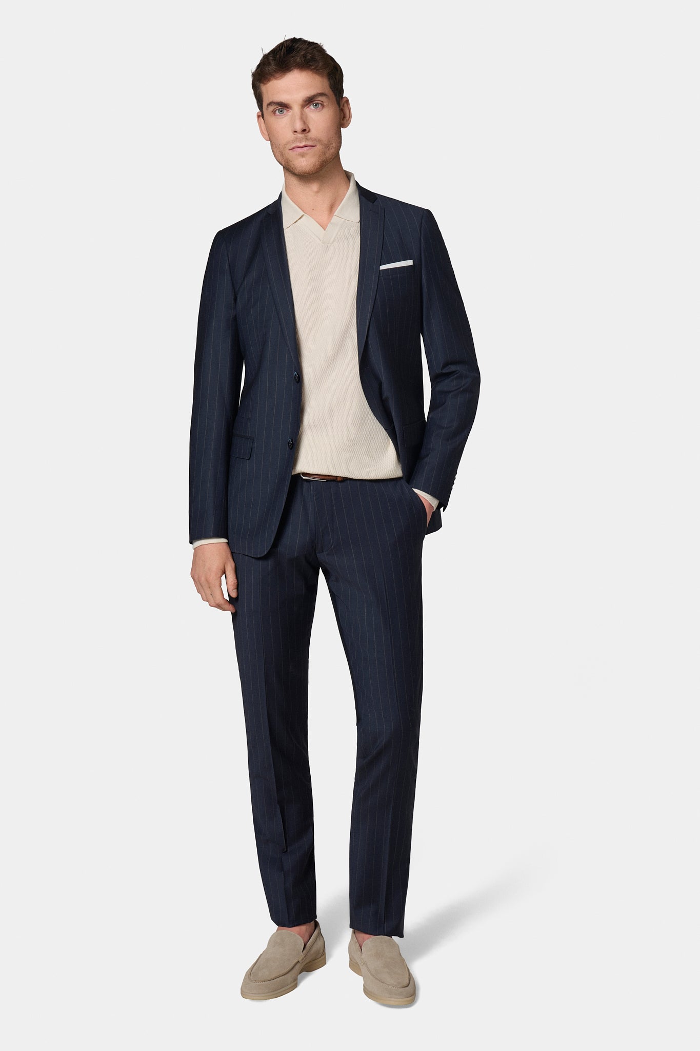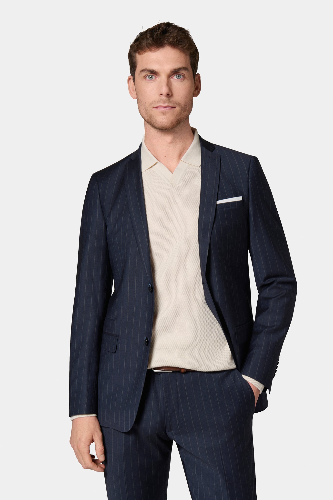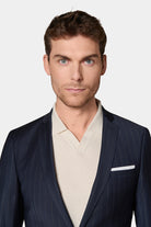 Coupe ajustée Tissu en laine mélangée à rayure craie bi-stretch Col cranté à boutonnière ornée d'un pin's Simple boutonnage Poche poitrine Poches à rabat réhaussées d'une poche ticket discrète Boutons de poignet Entièrement doublée avec quatre poches intérieures Fente d’aisance au dos