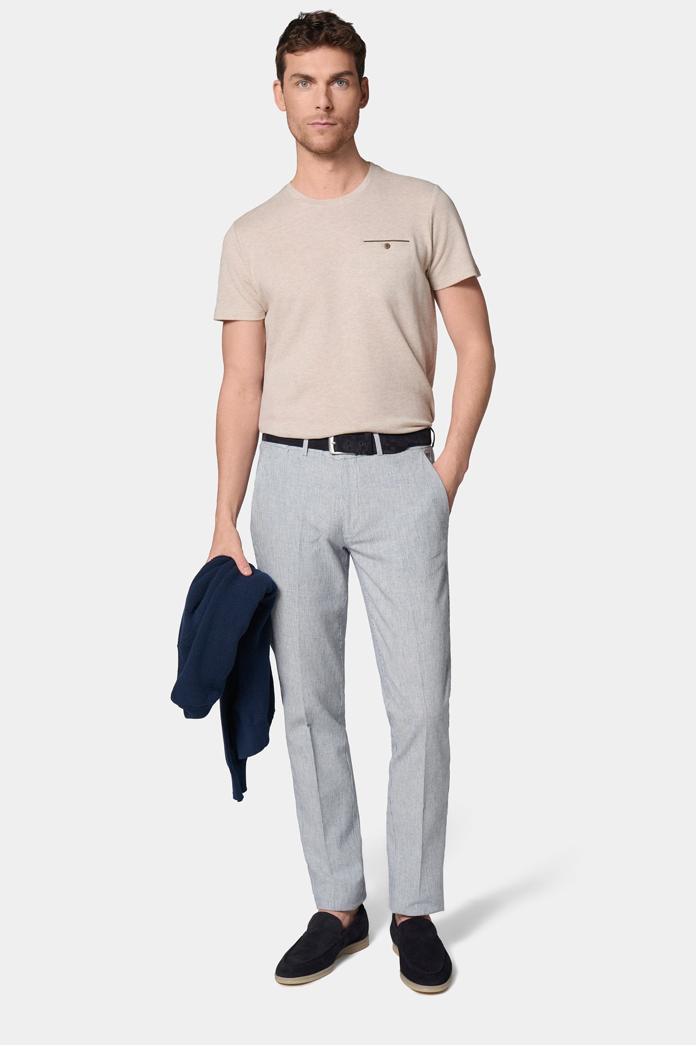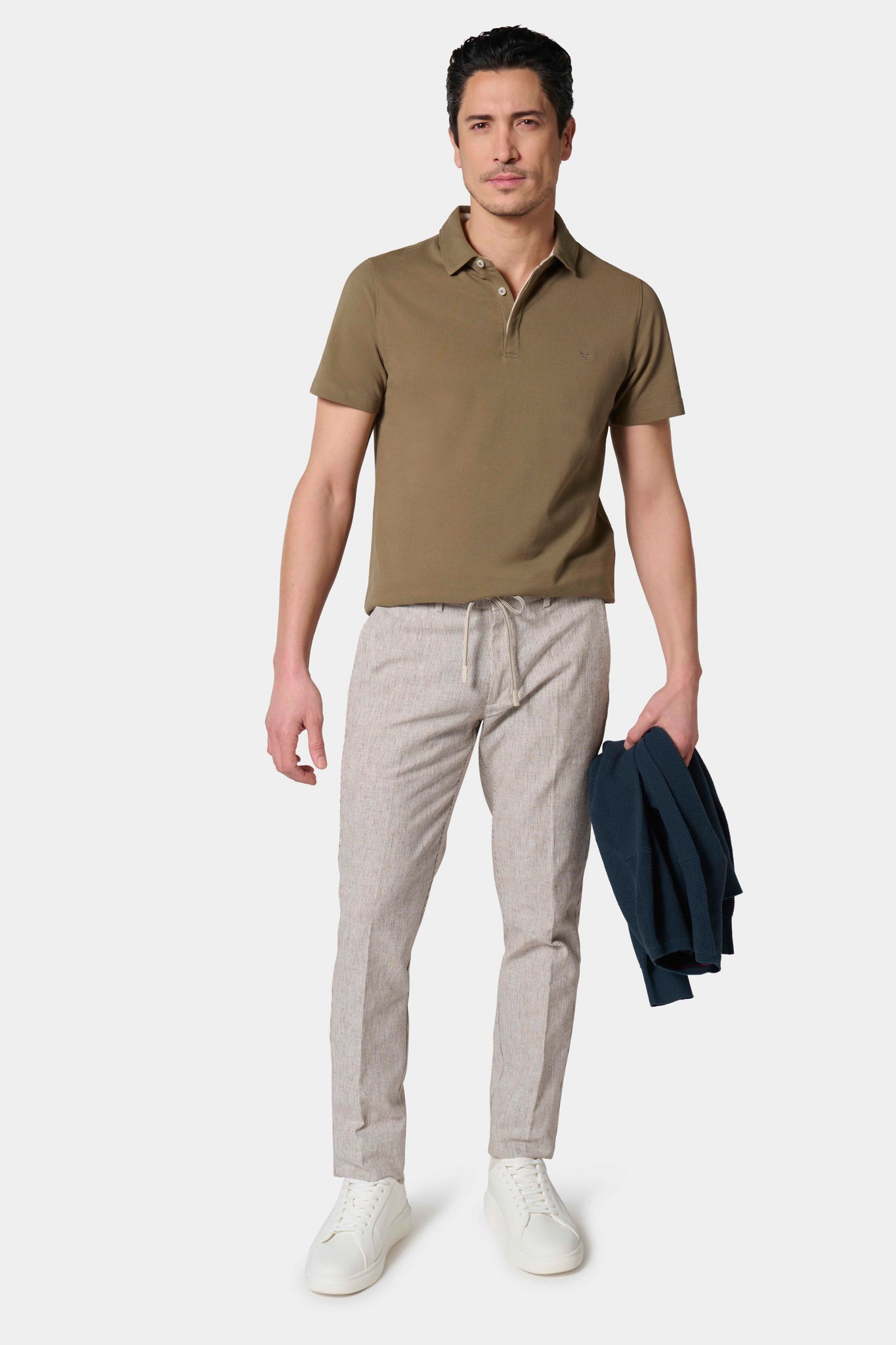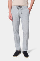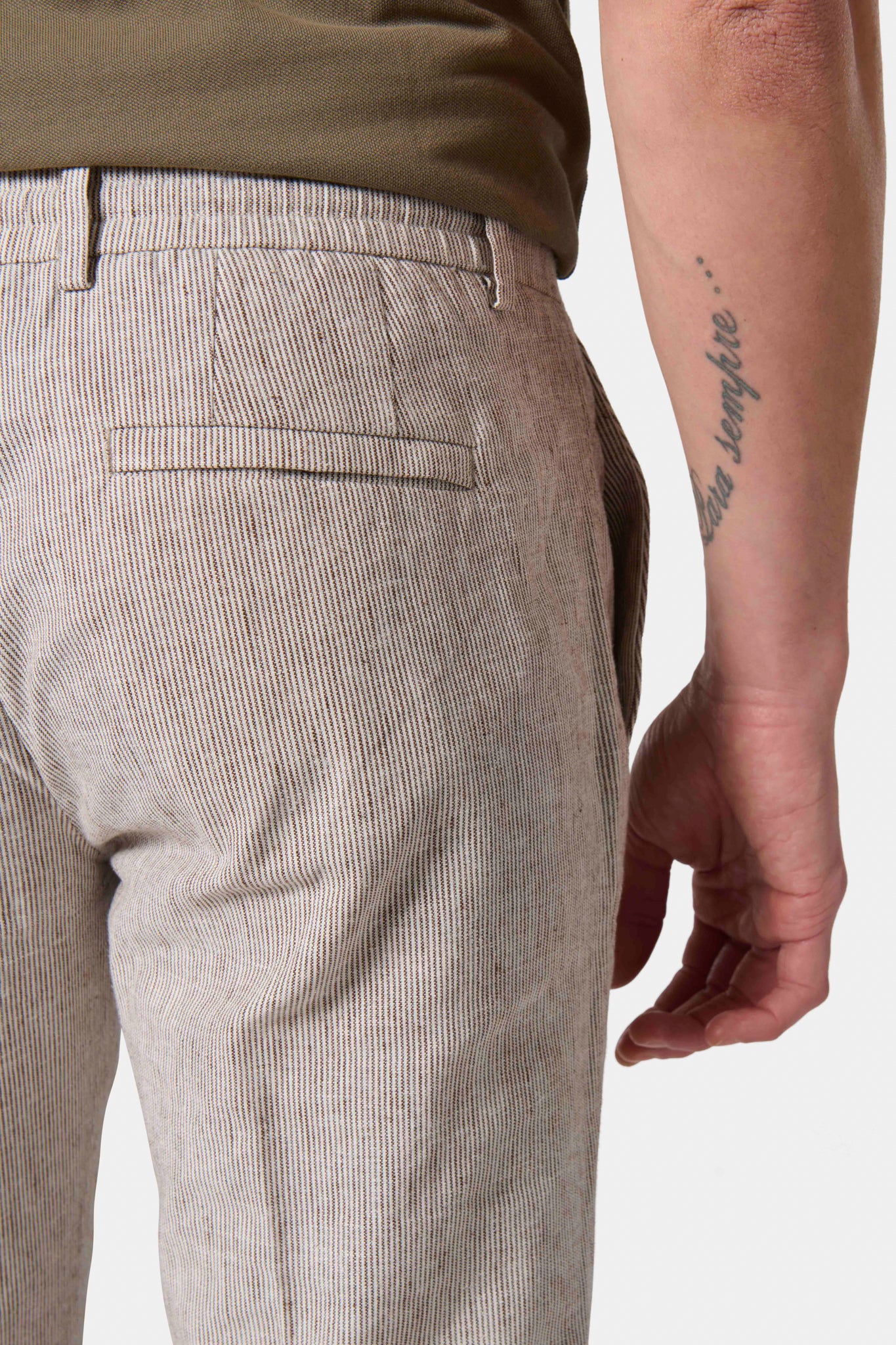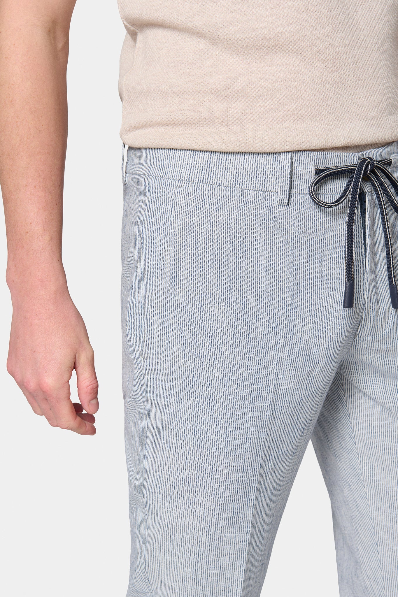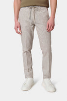 Tapered fit and low waist Linen-cotton fabric Semi-elasticated drawstring waist Zipper closure Hidden piped front pockets Minimalist hidden snap back pockets